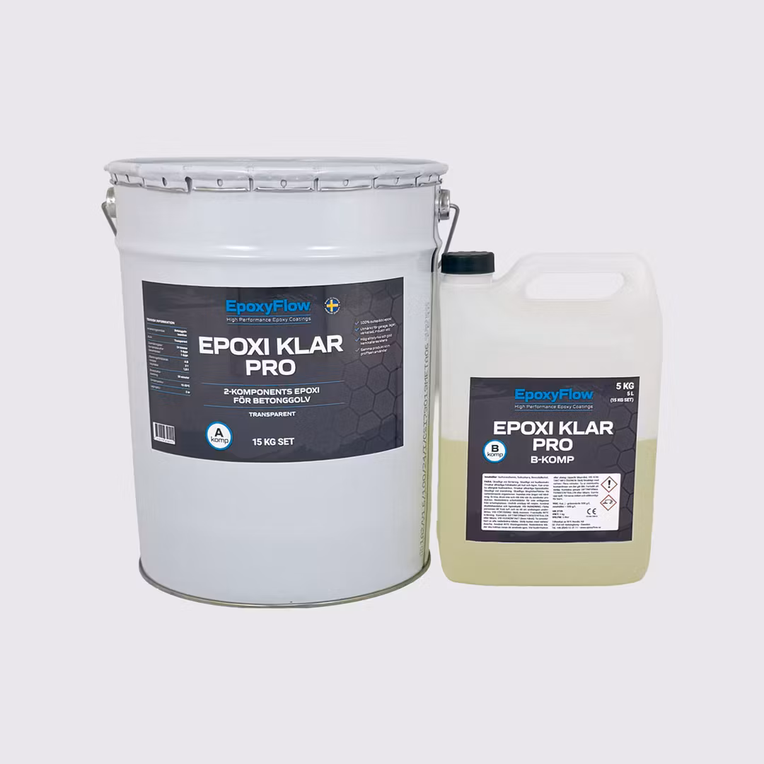 100% ren outspädd tvåkomponents transparent epoxi för betonggolv avsedd för tung belastning, till exempel bil- och lastbilstrafik. Samma produkt som proffsen använder. Epoxi klar PRO kan användas till olika system, bland annat primer, färgsandsgolv, spackel och topplack.