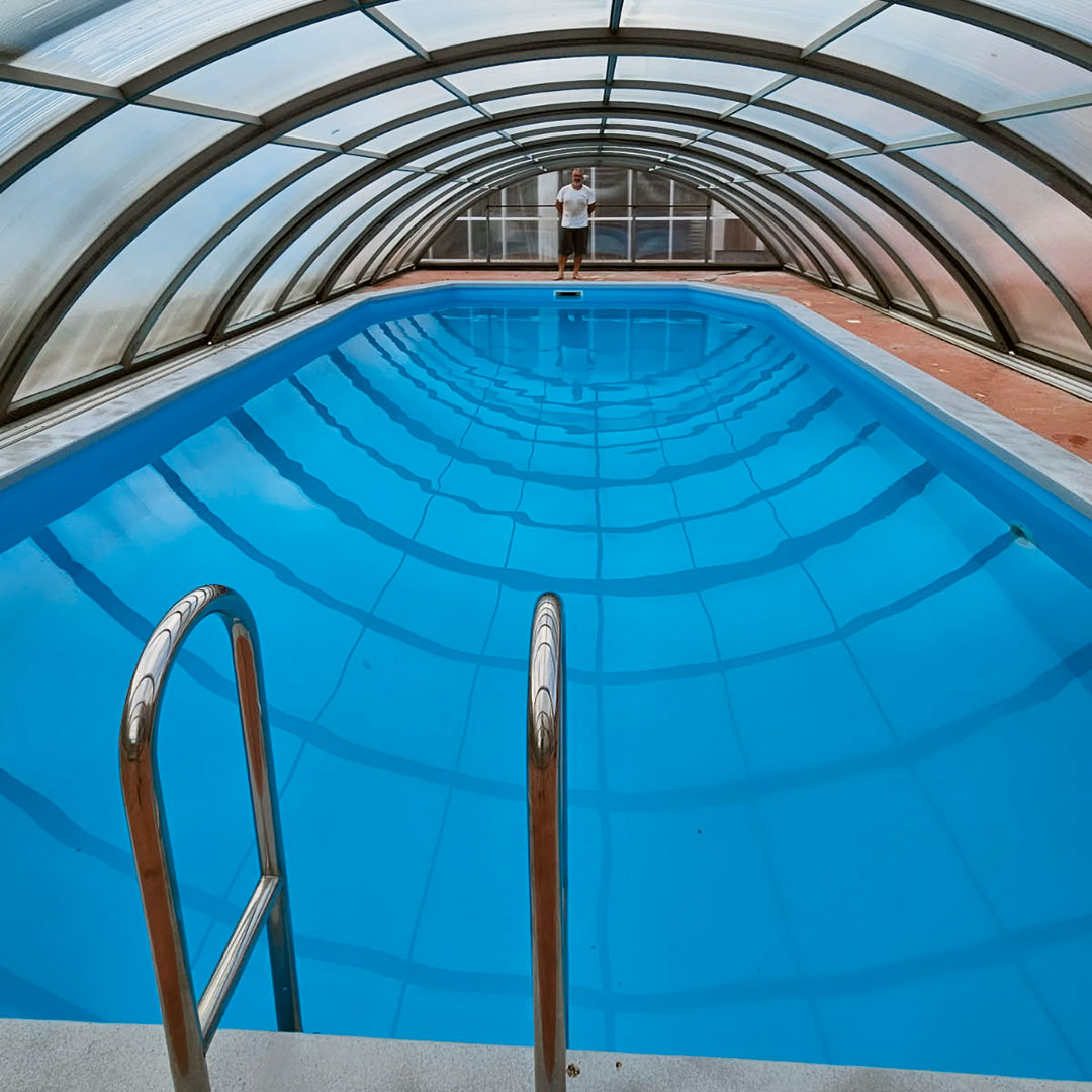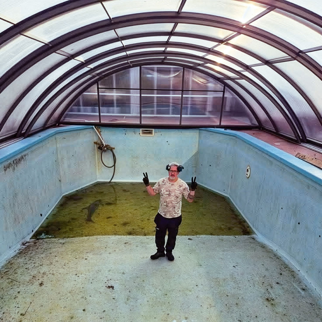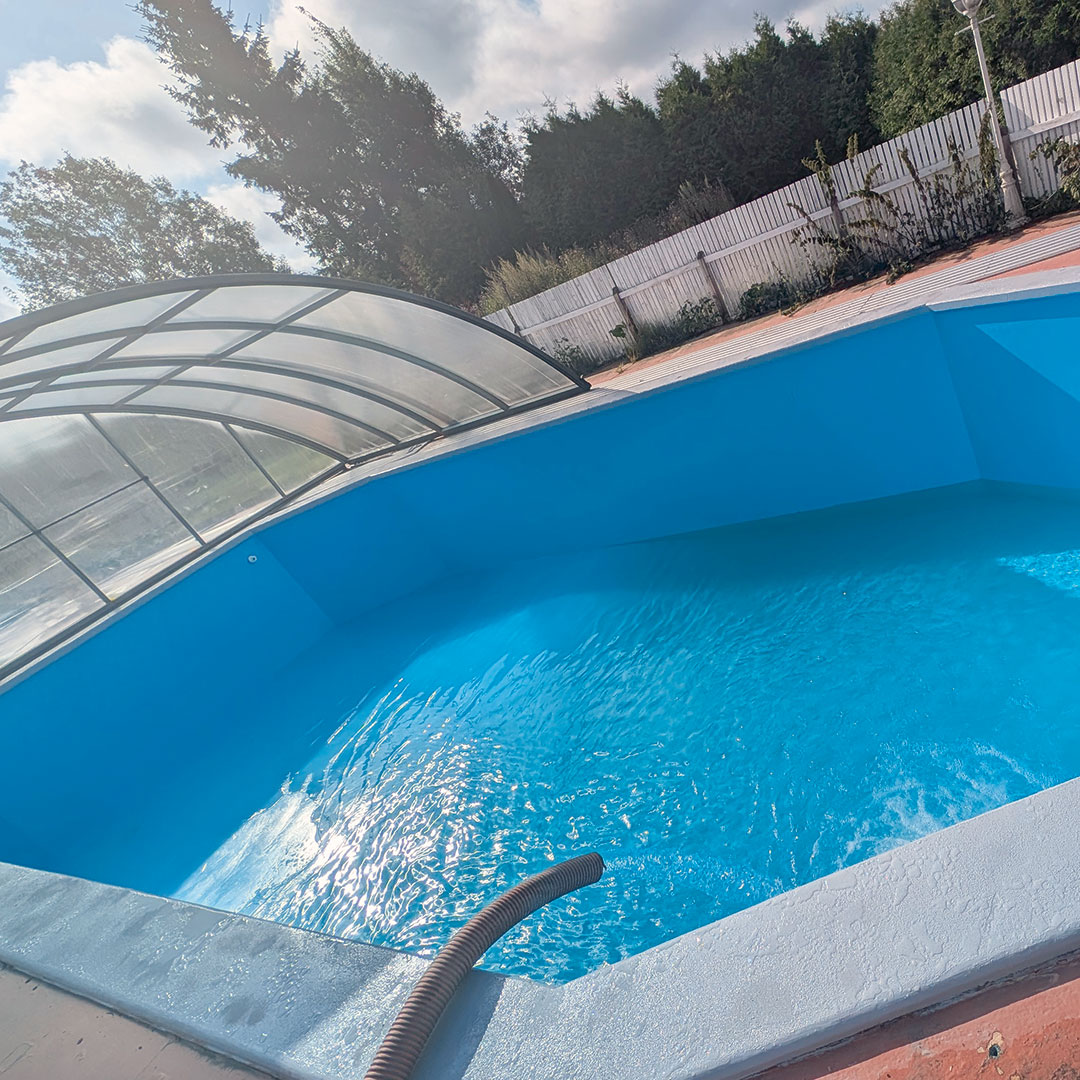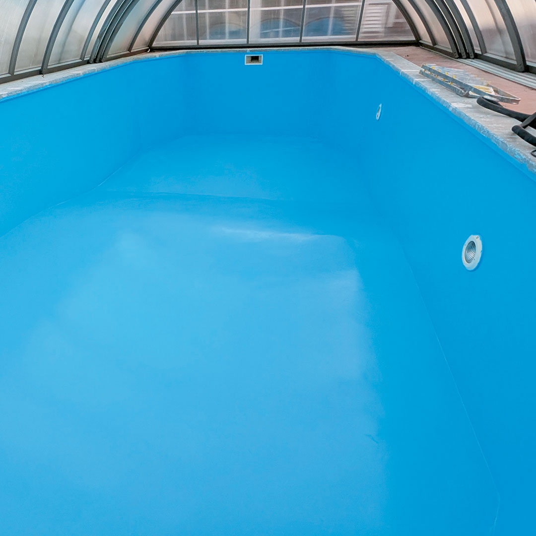 Vid renovering av denna betongpool i Degerfors valdes epoxifärg i ljusblå kulör. Den nya ytan ger poolen ett lyft samtidigt som underlaget förseglas och jämnas ut. Färgen bidrar till ett rent intryck och gör att poolen upplevs ljusare och mer inbjudande.