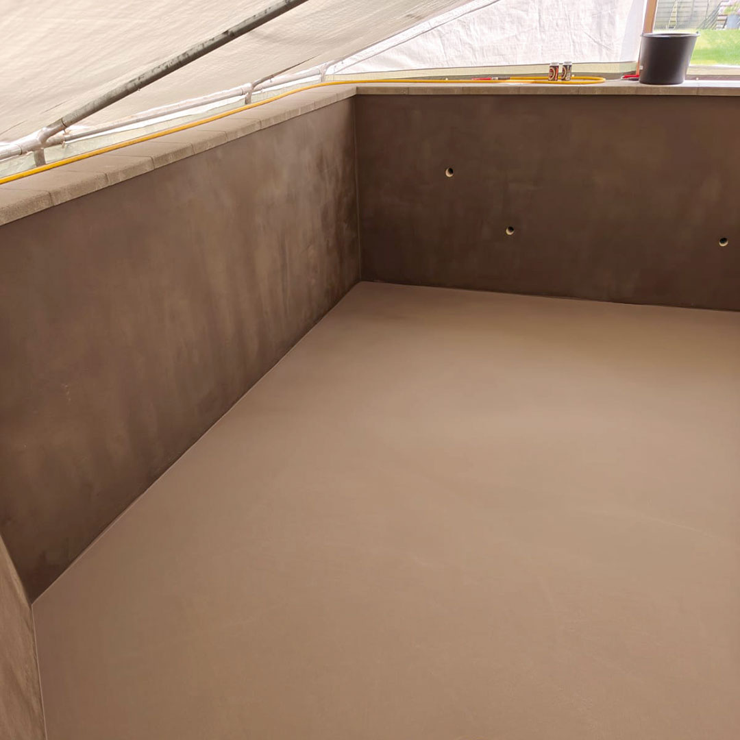 En betongpool utsätts för konstant vattentryck, kemikalier och slitage vid rengöring. Här användes en 2-komponents epoxyfärg anpassad för betongpooler, vilket ger en hållbar och skyddande yta med lång livslängd.