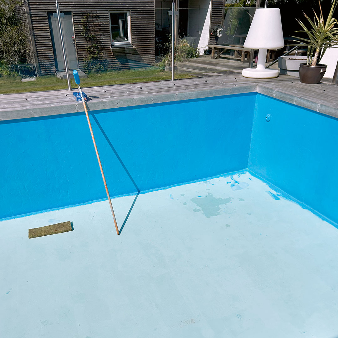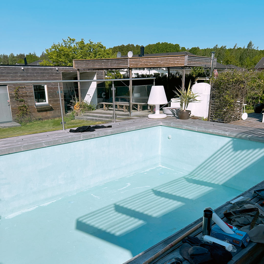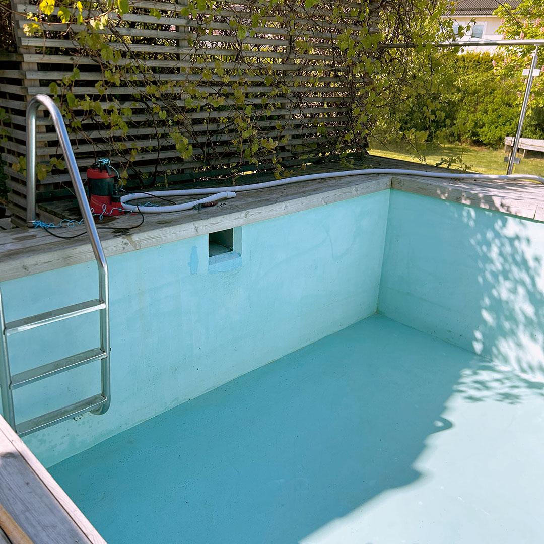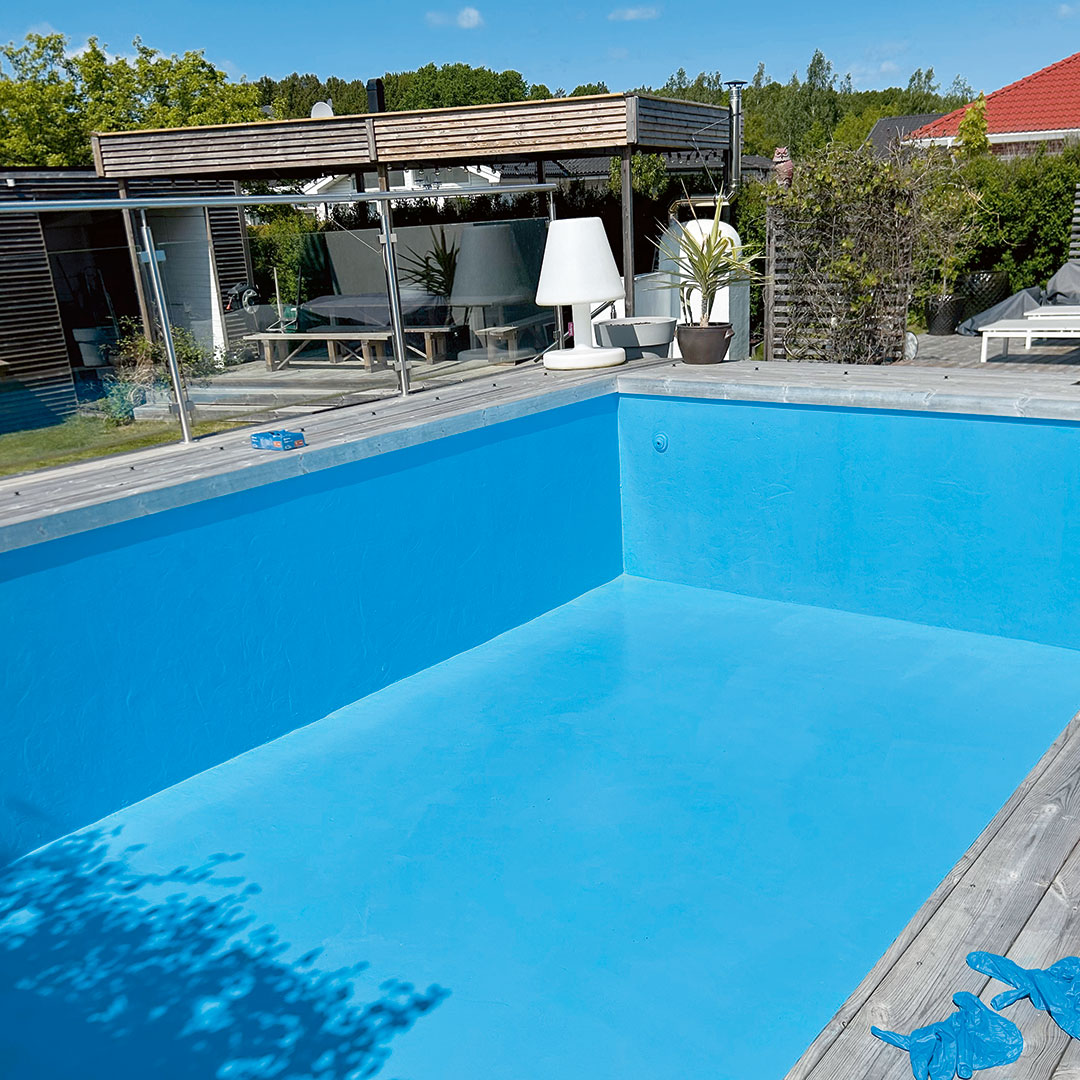 En betongpool i Västerås har målats i en ljusblå kulör som ger ett fräscht och inbjudande utseende. Ytan blir jämn och slitstark samtidigt som färgen förstärker känslan av klart vatten.