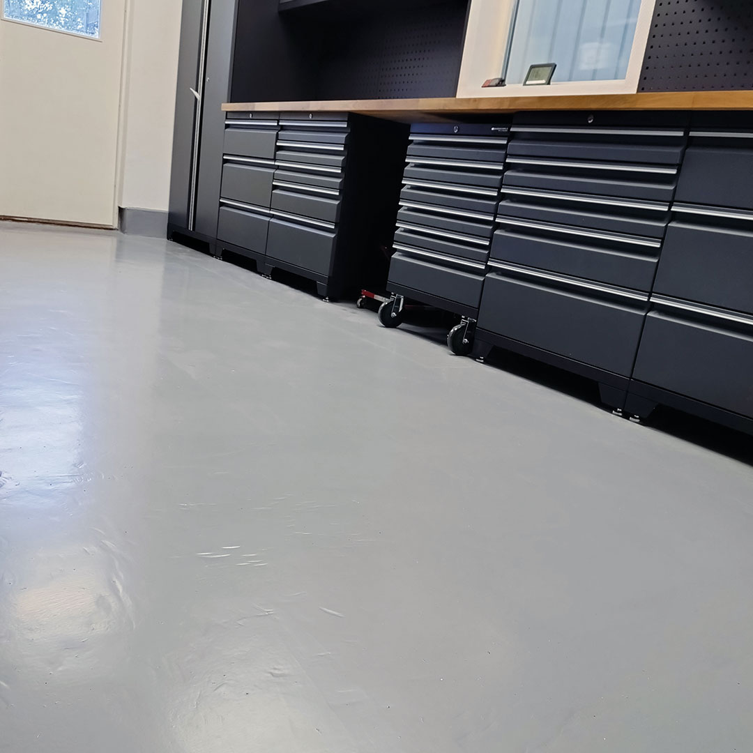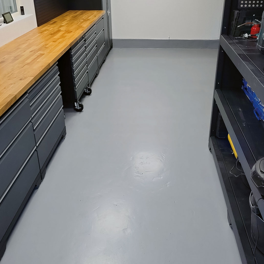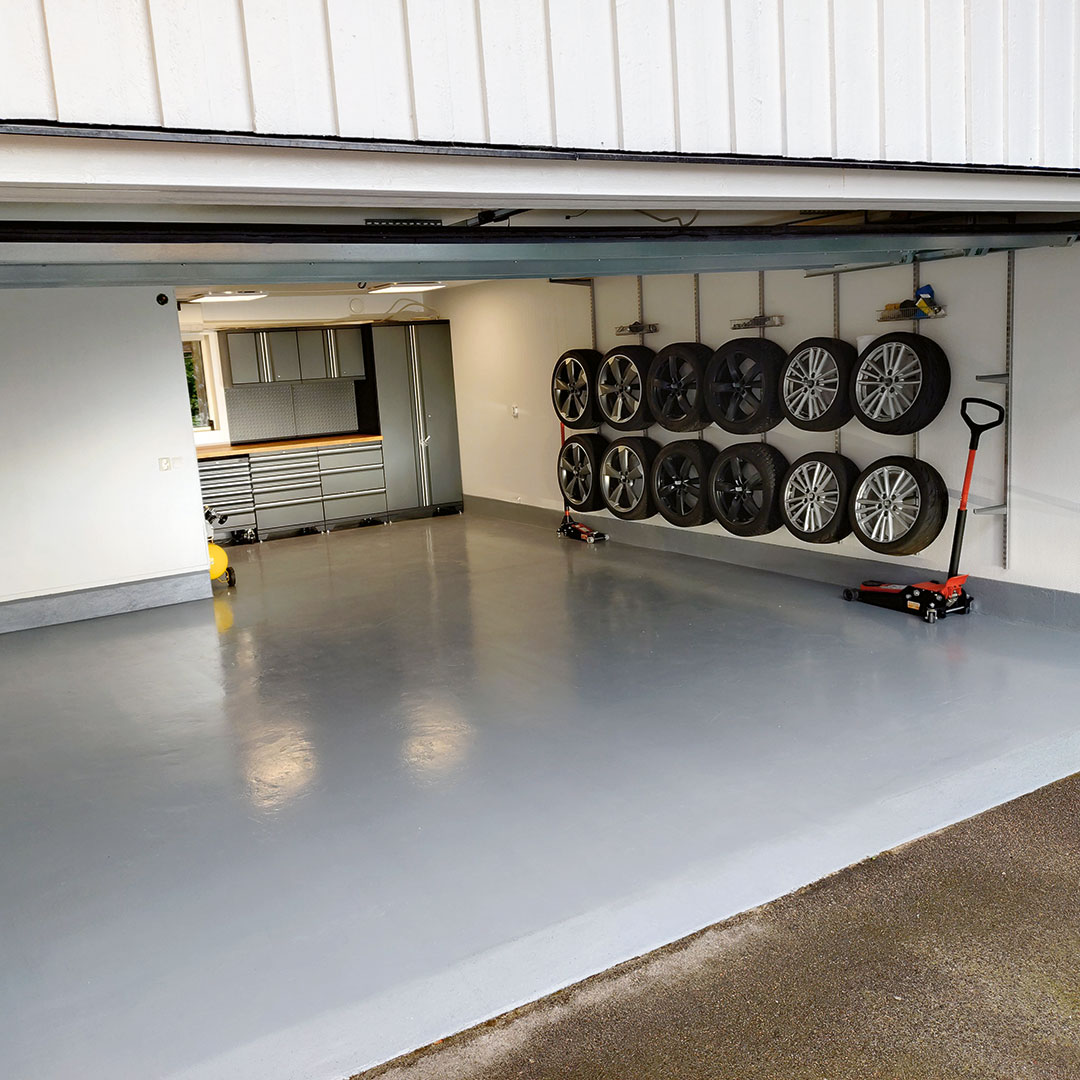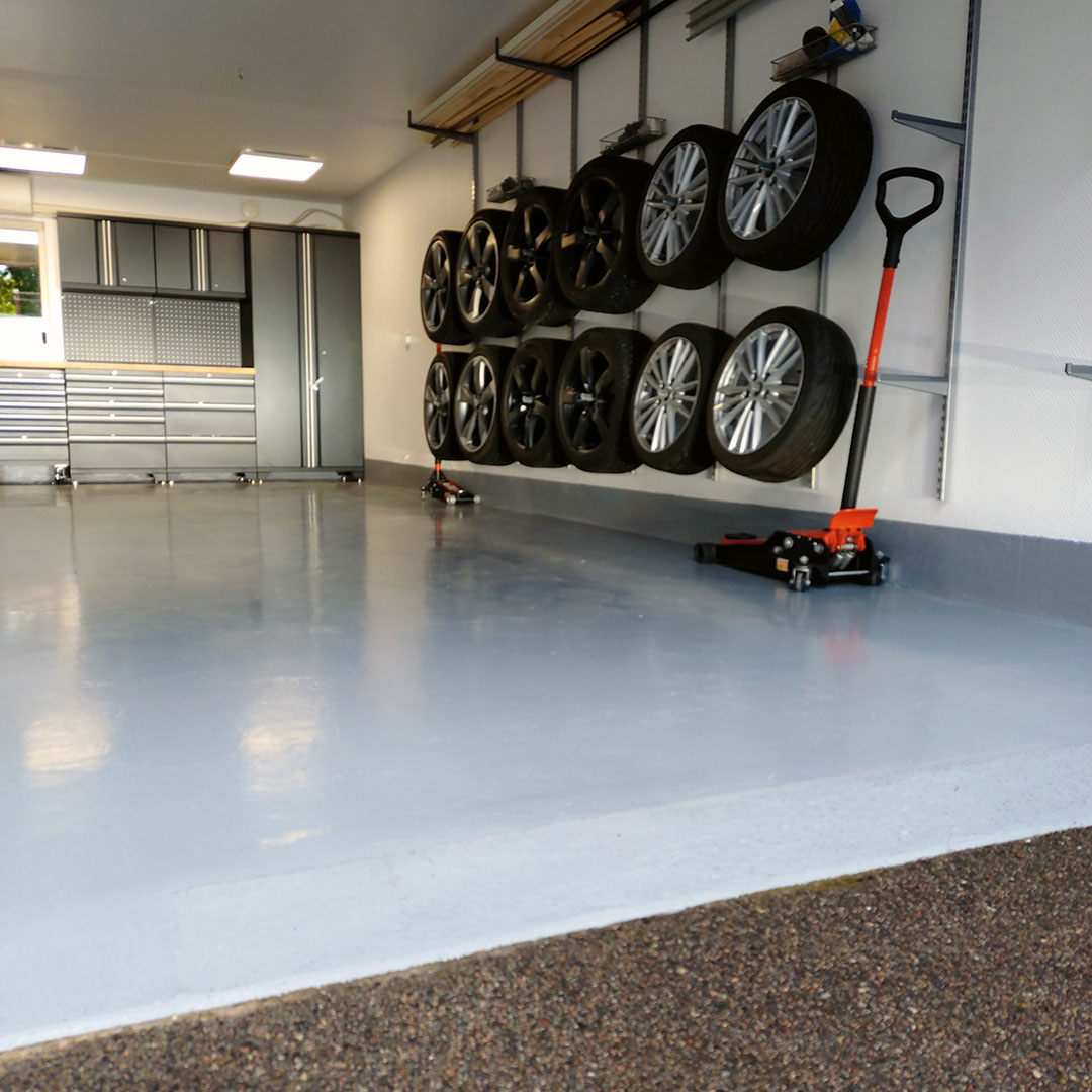 Ett garagegolv behöver klara återkommande belastning från fordon och kontinuerlig användning. Här användes därför ett epoxygolv med epoxyfärg för medeltung belastning som är anpassat för fordonstrafik från bil utan dubbdäck och ger en slitstark, kemikalieresistent yta.