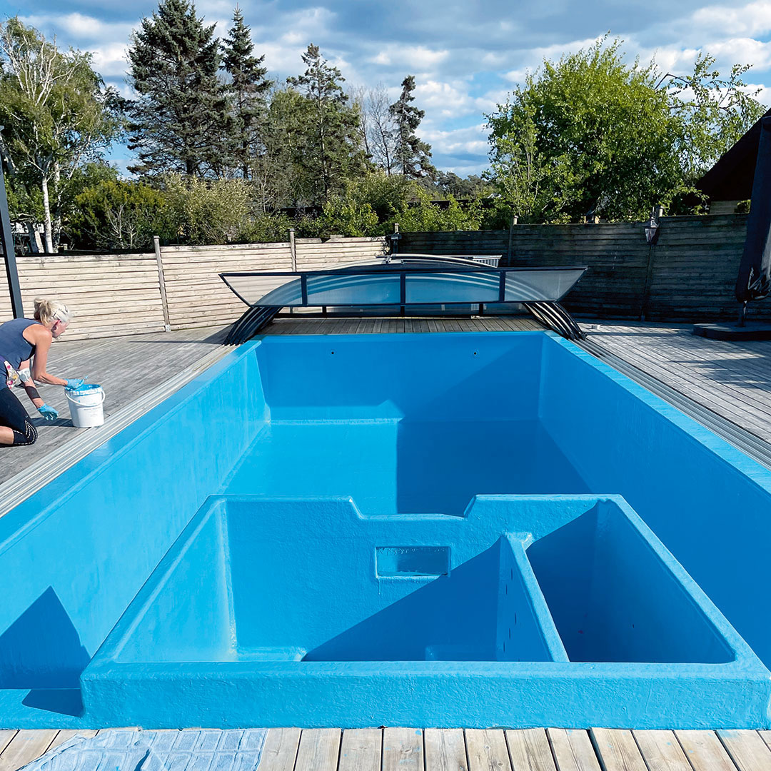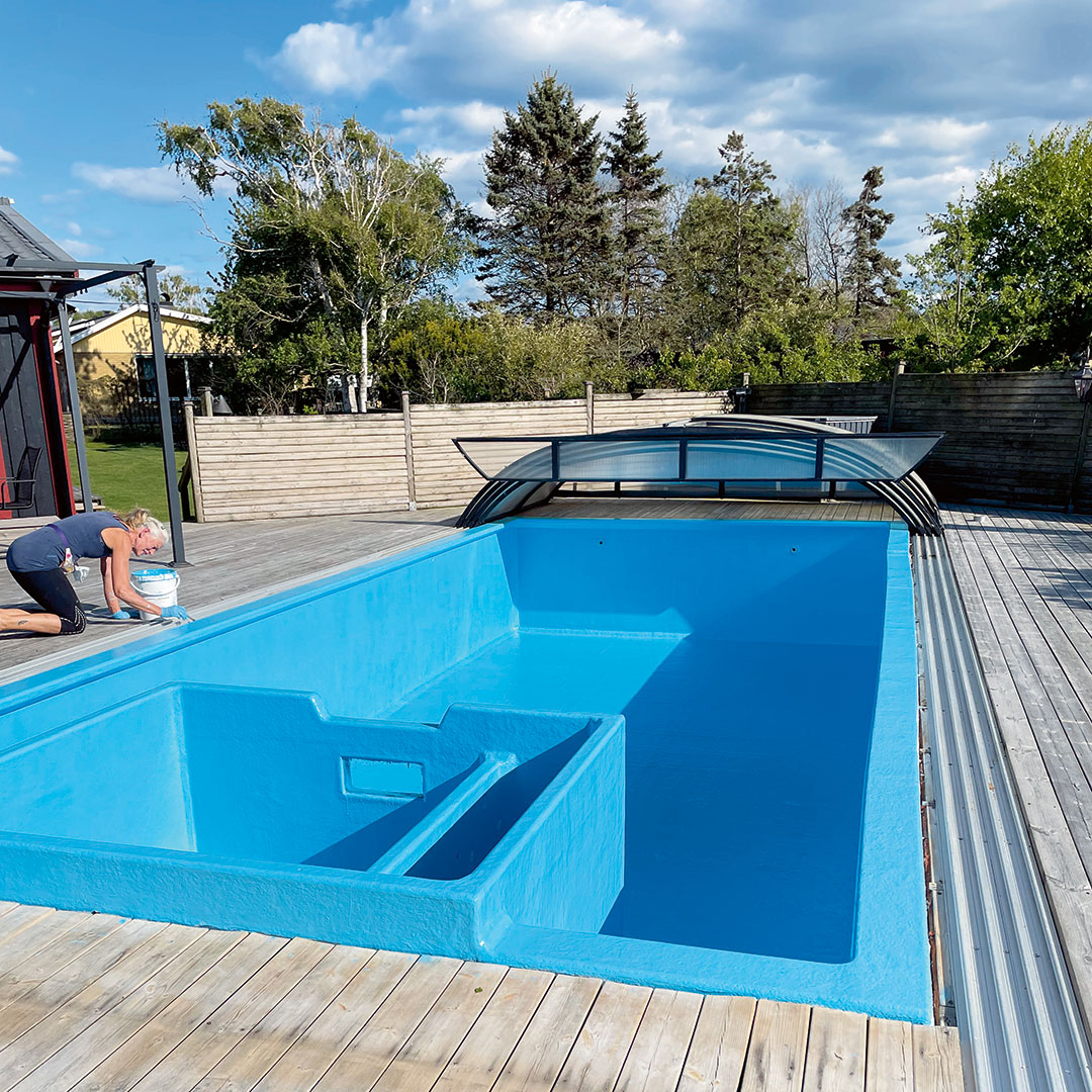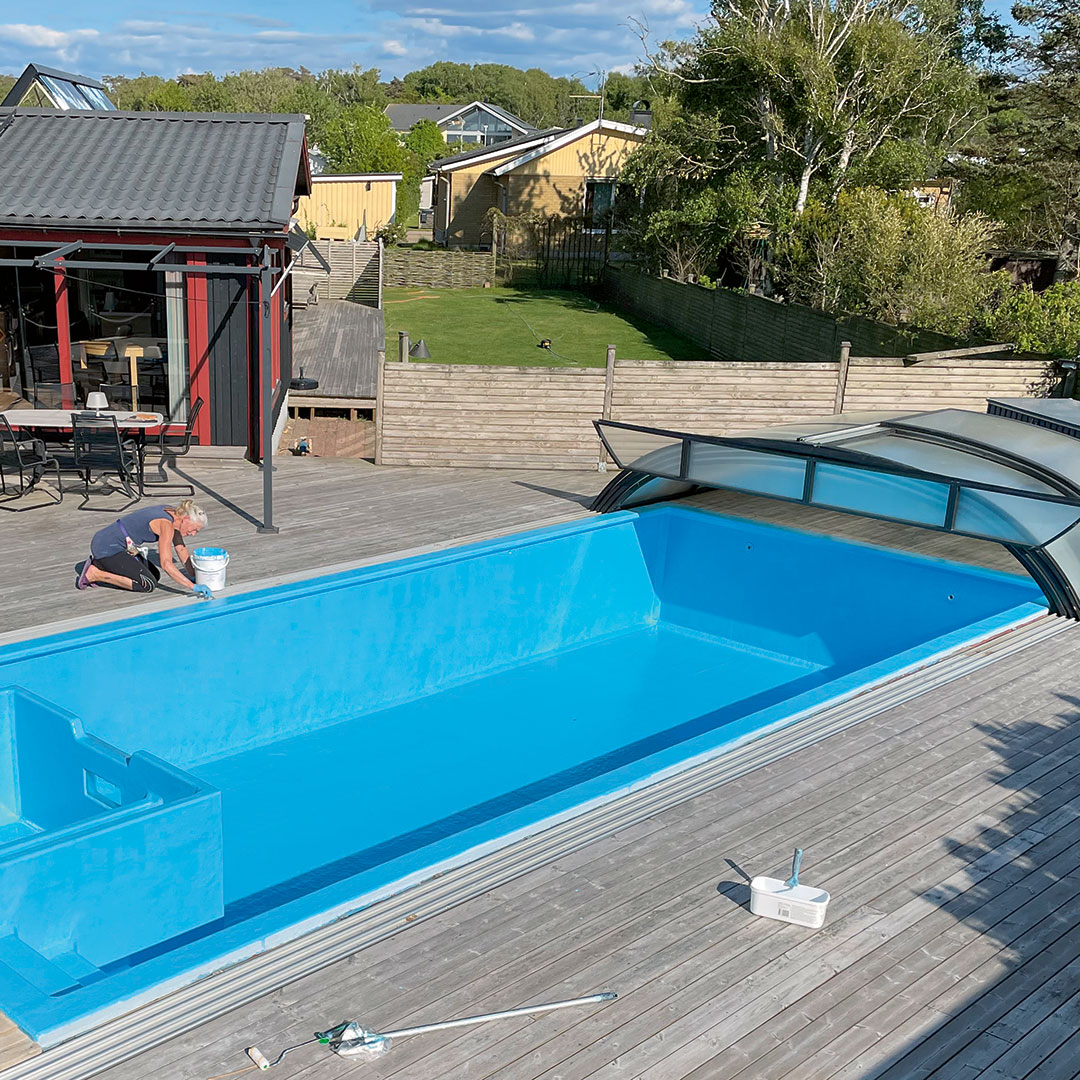 För glasfiberpooler krävs en färg med god vidhäftning och tålighet. Med epoxyfärg skapas en yta som klarar både vatten och slitage utan att tappa finish. Resultatet blir ett hållbart och lättskött poolsystem.