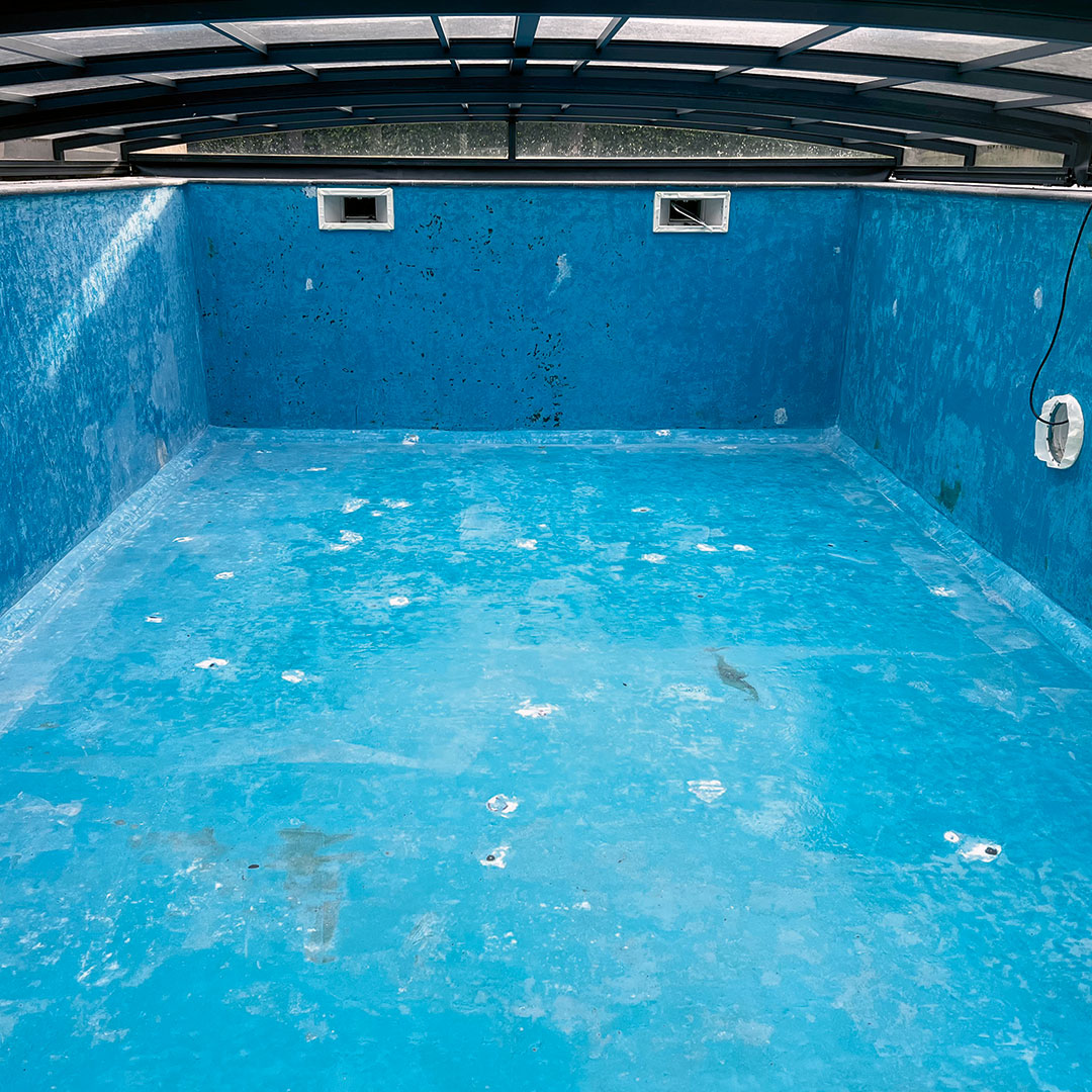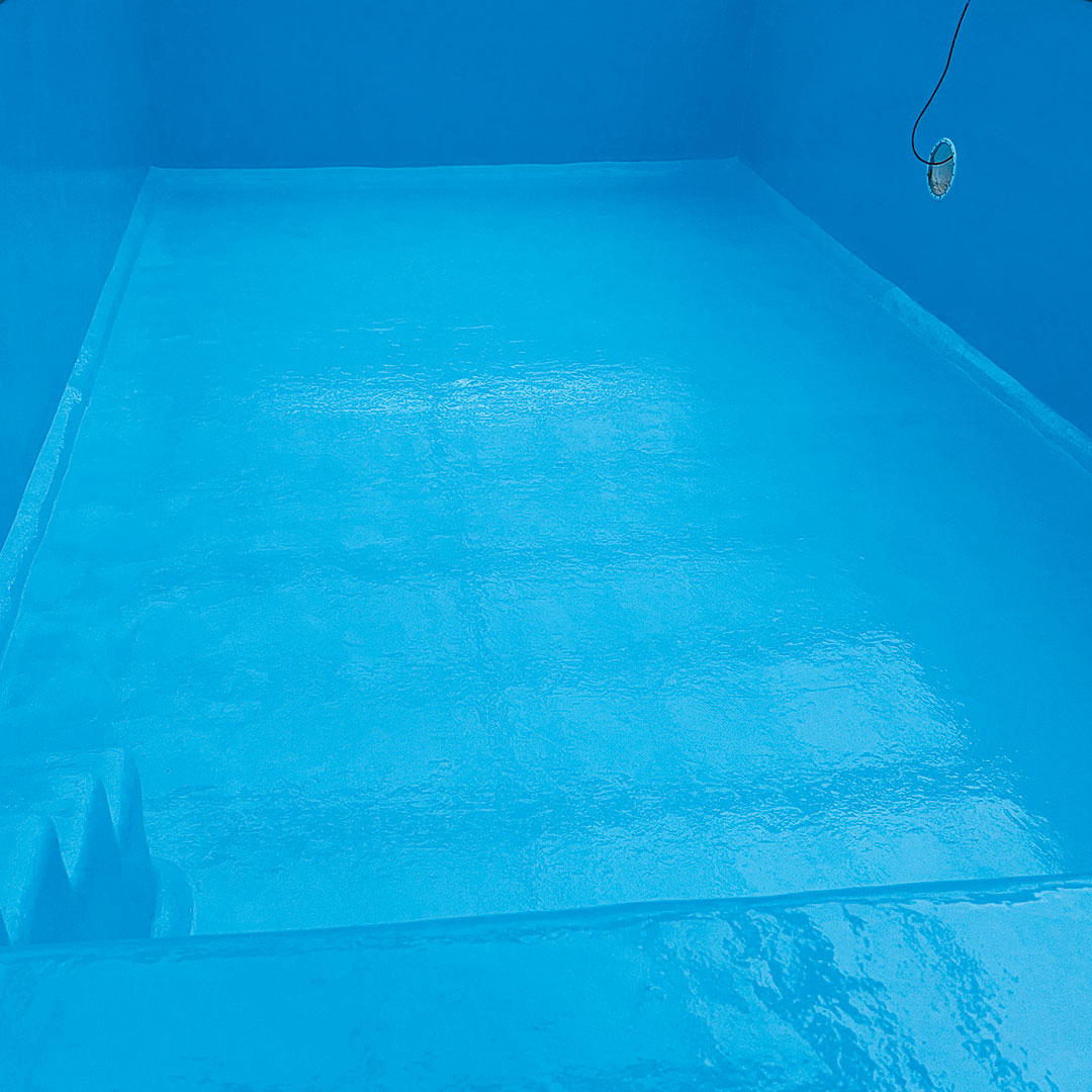 Poolmiljöer ställer höga krav på både slitstyrka och vidhäftning. Här användes därför en slitstark epoxyfärg anpassad för poolmiljö som ger en tålig och lättskött yta med lång livslängd.