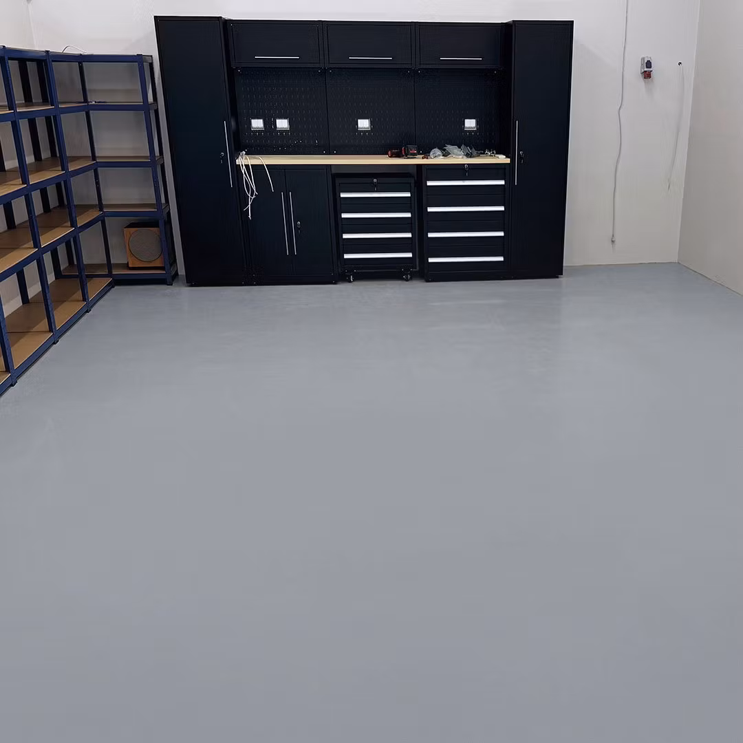 Golvet i denna verkstad i Eskilstuna målades med epoxigolv WB för att skapa en slitstark och lättskött yta anpassad för daglig användning. Den blanka finishen ger ett enhetligt intryck samtidigt som golvet blir enkelt att rengöra och underhålla över tid.