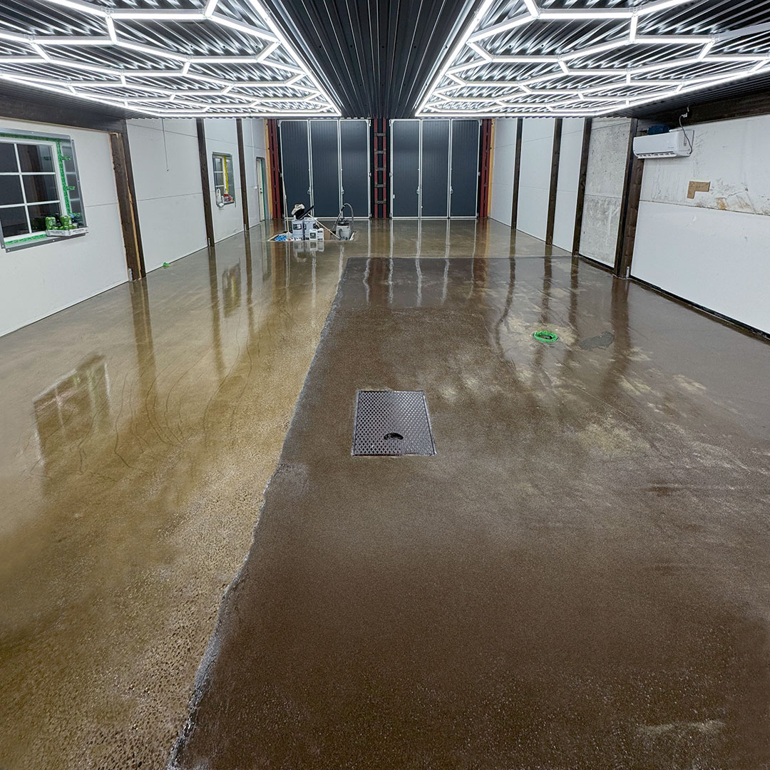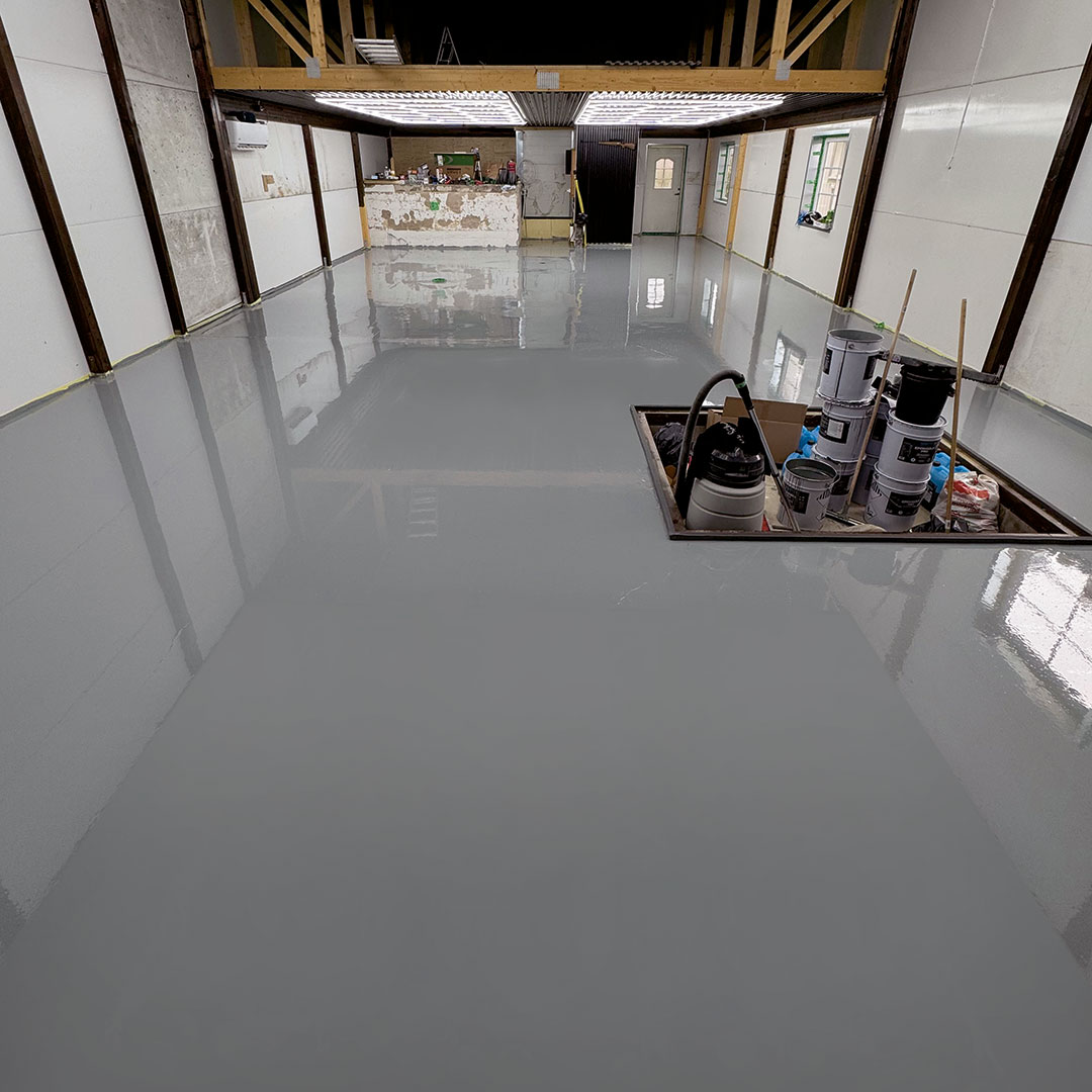 En verkstad i Götene har fått ett nytt epoxigolv i mörkgrå kulör. Den stora ytan ger ett enhetligt och professionellt intryck samtidigt som golvet är anpassat för tung användning.